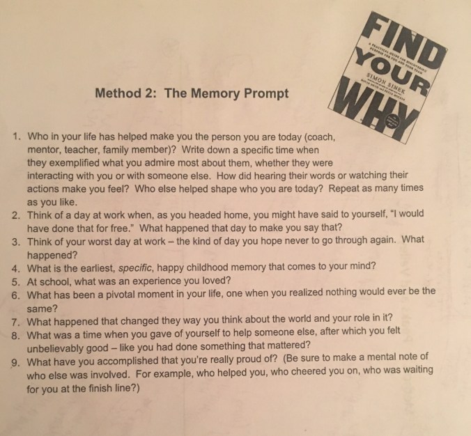 We were to map at least five peaks and valleys in our lives; if we needed help, we could use a memory prompt based on the work of Simon Sinek:
