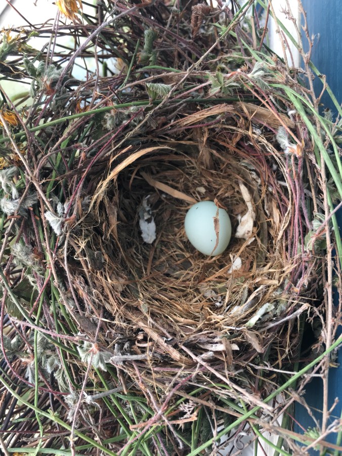 “All right, you guys,” I announced to my menfolk, “we now have a nest on our wreath with an egg in it. No opening the front door until these birds are gone.”