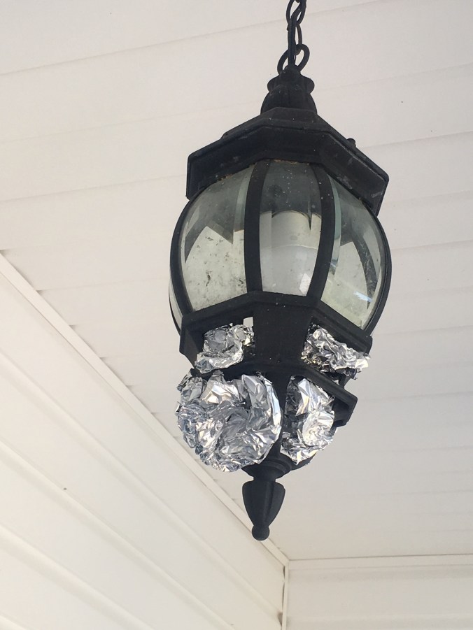 It sent the finches into a frenzy. For another day, the loud bird-chatter resumed. I found a bit of foil on the porch floor; had one of them tried to tug the stuff loose?