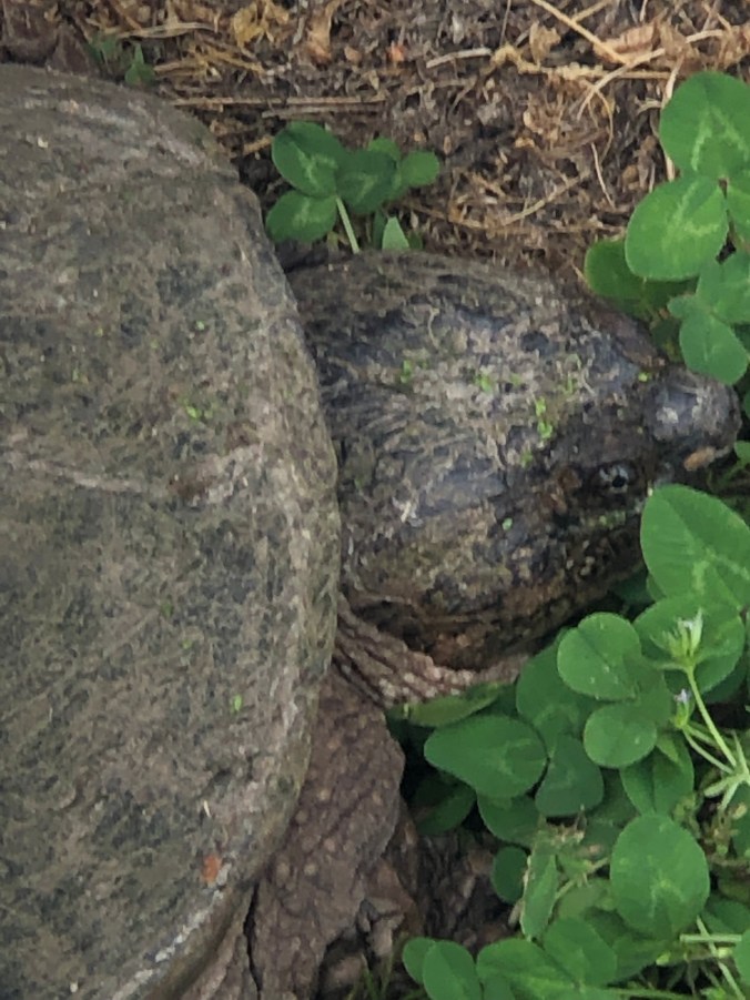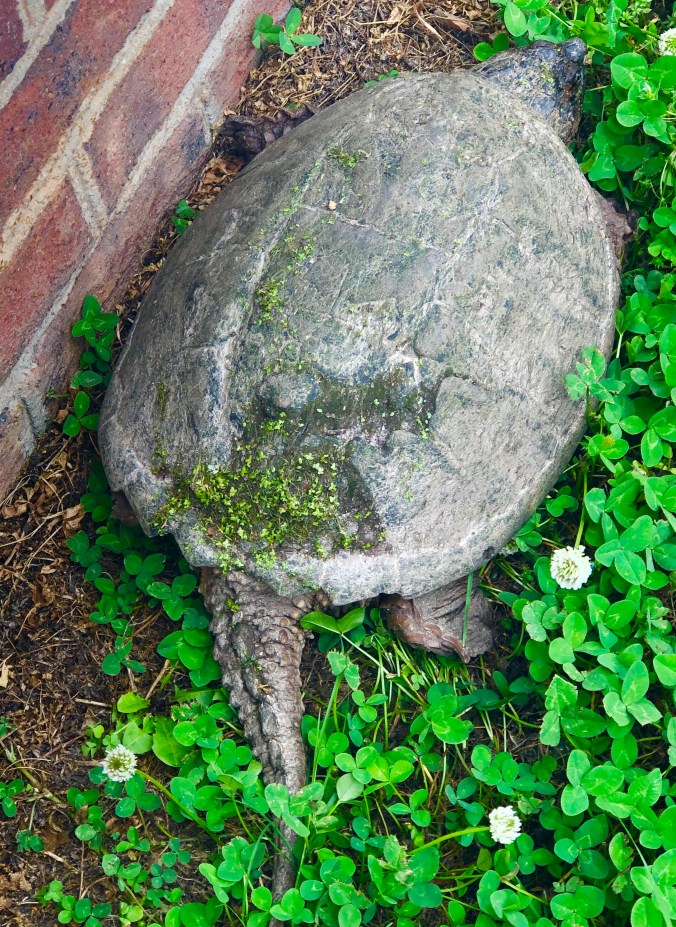 Okay, not really dinosaur, just the biggest snapping turtle I’ve ever seen. In my yard, in the clover. With algae growing on her shell.