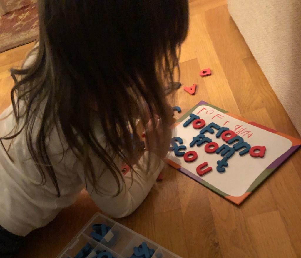 The other night she asked me to spell words for her with magnets on a whiteboard. I did, without realizing that she intended to copy them with a marker.