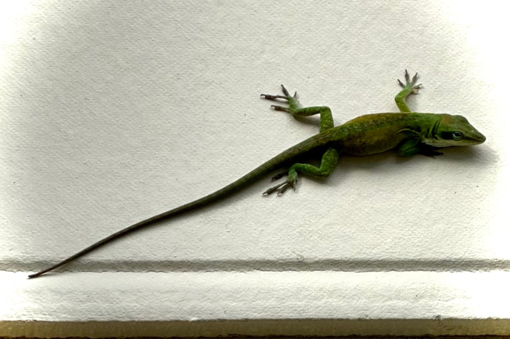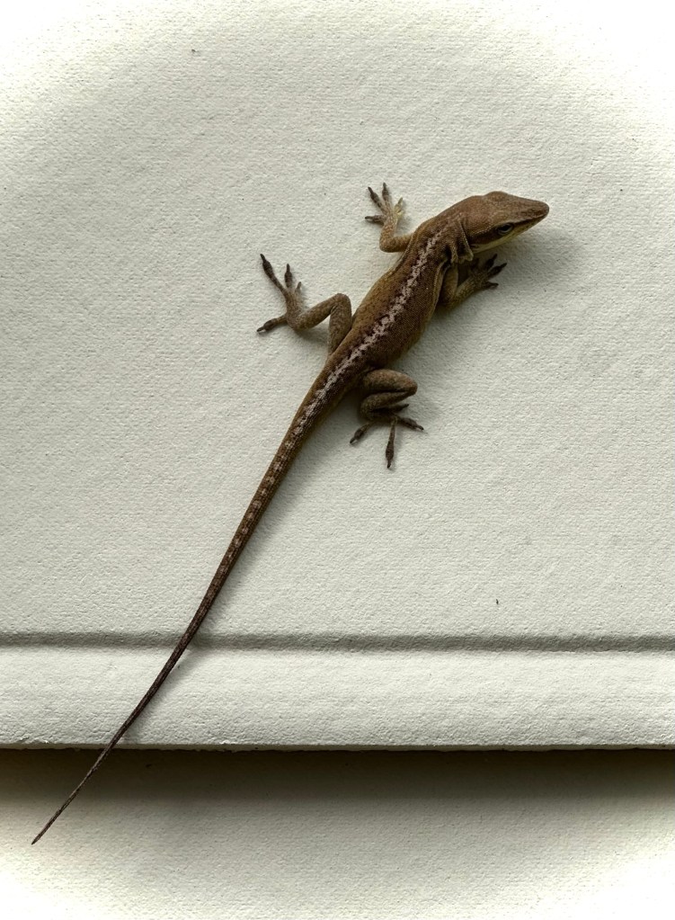 Anolis carolinensis, green anole, Carolina anole: call it what you will, it is hanging out on the side of the house, basking in the October afternoon sun, feeling green…