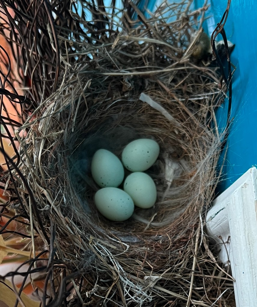 Hi, Celia! The eggs should hatch in a couple of weeks. I feel it is an honor to have them living so close, in the shelter of my porch. Tweety was an escape artist – he opened his cage door numerous times for a flight around the house!