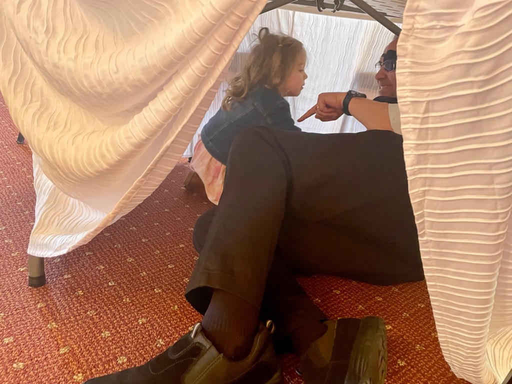 She came to the recent wedding shower for her Dada’s younger brother. She crawled under the church fellowship hall table to play. Grandpa, the pastor, crawled under with her.