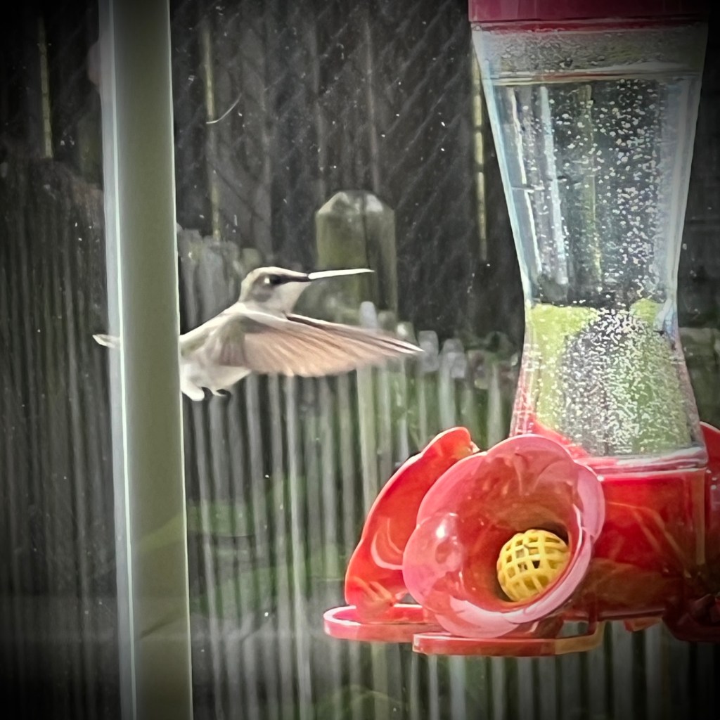 In the predawn hours, with a rainstorm raging and my electricity out, it’s too dark to see anything beyond my window except for the feeder. It still holds. Freshly replenished. I will ensure that it remains so for as long as my hummingbird should have need of it.