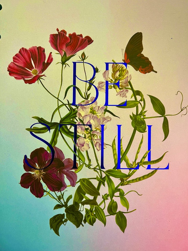 I contemplate the illustration on my planner page. Living things are woven into the words Be still. The upper flowers appear to be cosmos, the Greek meaning orderly, harmonious; the opposite of chaos. These flowers attract pollinators which perpetuate life (note the butterfly). The garden cosmos is often symbolic of knowledge, beauty, and happiness. Be still and know…