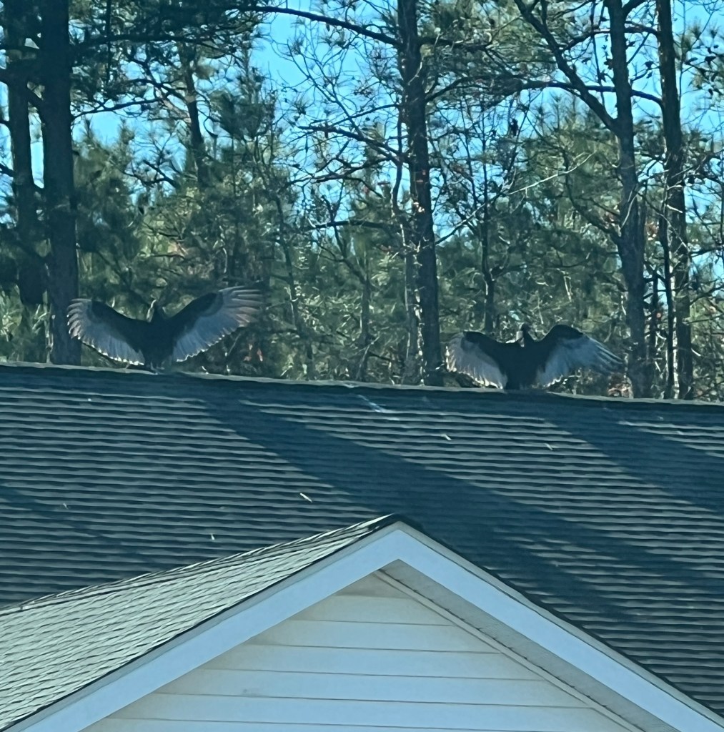 Sunday, December 8, 2024: The sight when I pulled into the church parking lot. The buzzards (black vultures) remained motionless atop the fellowship hall, disinfecting their wings in the bright sunlight, until the parking lot got too people-y for them and they flew off. Gotta admit this looks ominous, like something out of Poe or painted on the wall of an ancient tomb. Black buzzards are, however, “highly social birds with fierce family loyalty,” says the Cornell Lab of Ornithology. No wonder the church fellowship hall was so appealing to them for their own sun-day.