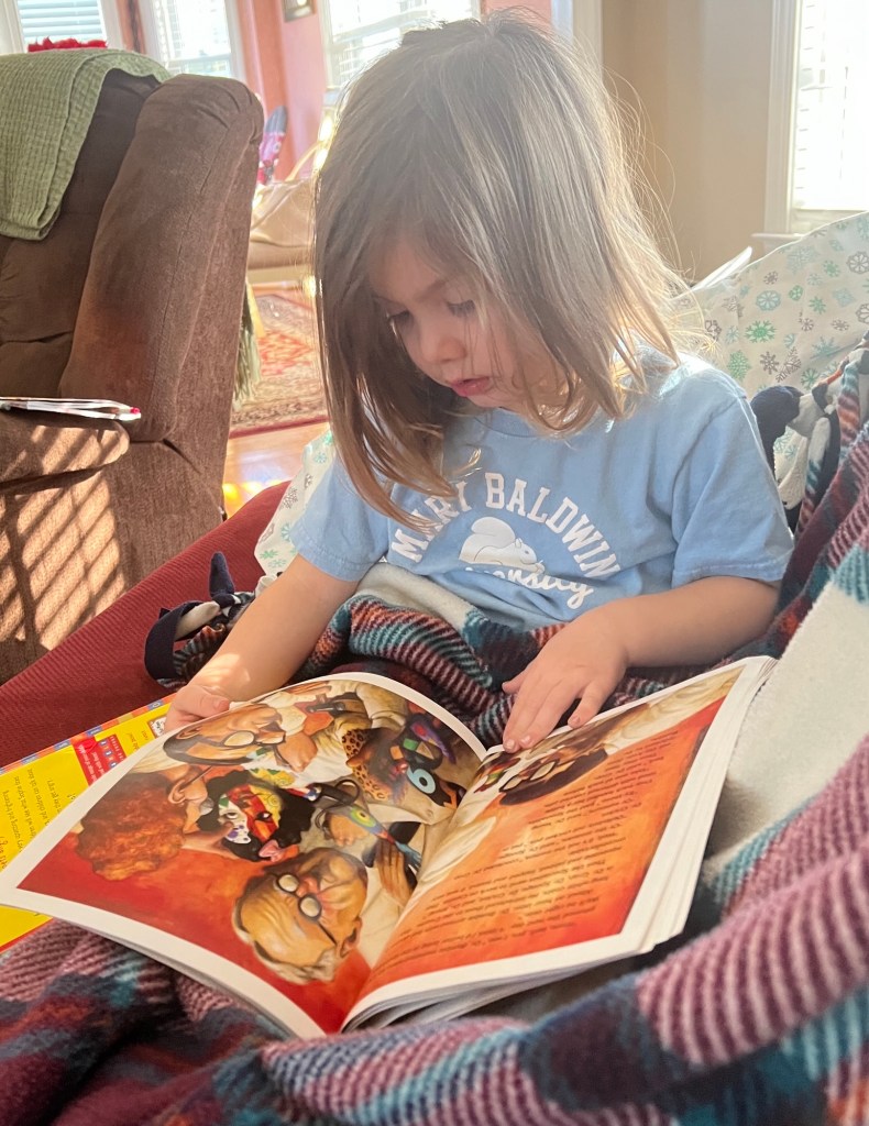 She is three sitting by me on the couch open book in her hands head bent so intent in her study of detail in the picture