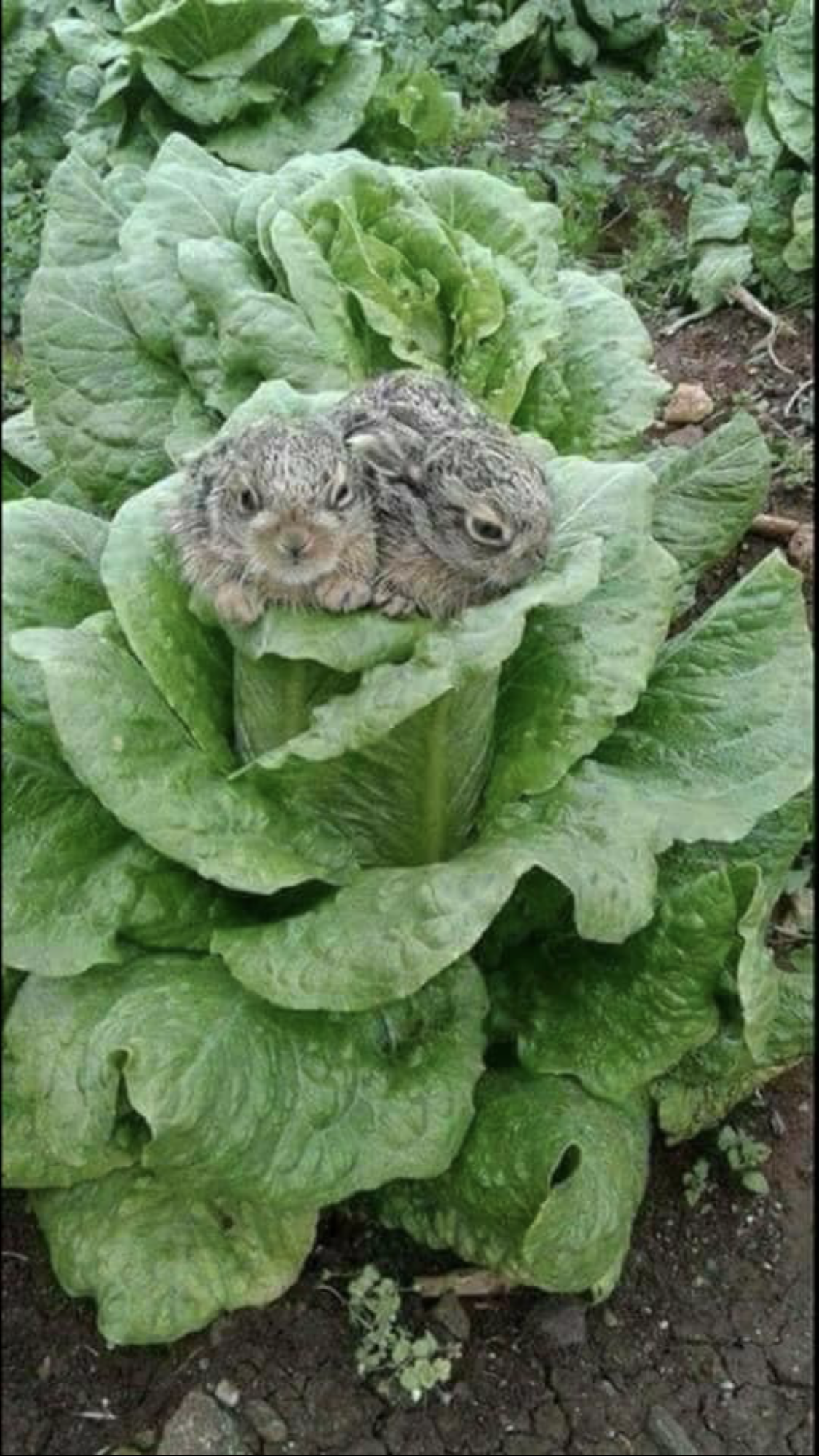 Until I promptly stumbled upon this garden photo with two baby bunnies nestled in a head of—cabbage?